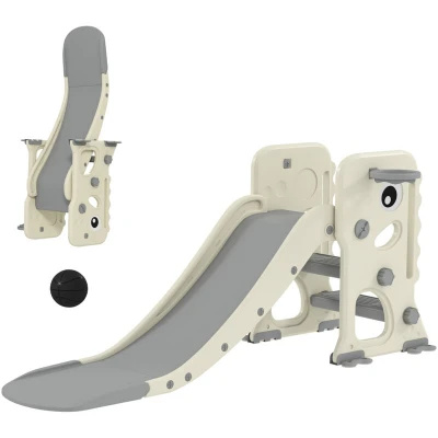 AIYAPLAY 3 in 1 Kids Slide, Foldable Dinosaur Shape Toddler Slide with Climber, Basketball Hoop and Ball, Indoor Playground Equipment for Ages 2 5, Cream White