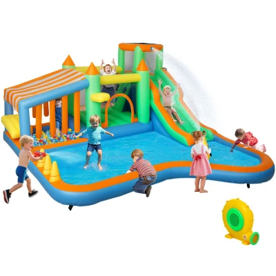AIYAPLAY Bouncy Castle, Inflatable Bounce House Trampoline with 680W Blower, Water Slide, Splash Pool, Basketball Hoop, Ball Pits, Climbing Wall, Gun, Ring Toss, for Kids Outdoor Indoor