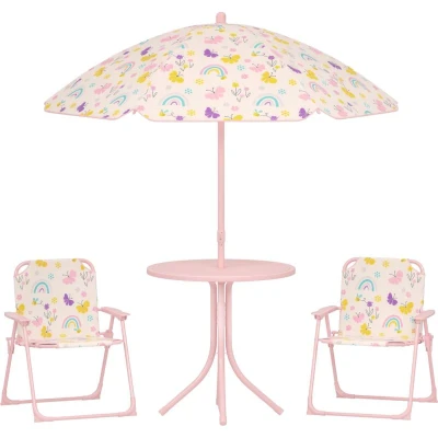 AIYAPLAY Children Table and Chair Set with Adjustable Parasol, 2 Folding Chairs, Picnic Table, Rainbow Pattern Outdoor Patio Set, for Ages 5 Years, Pink