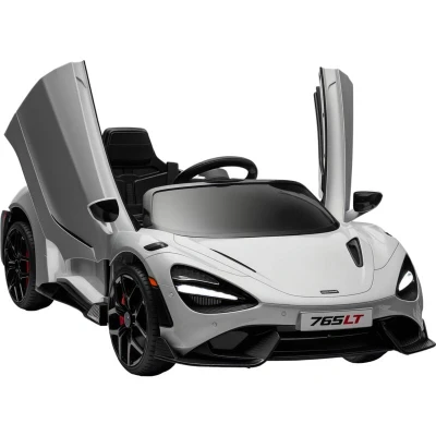 The McLaren 765LT ride-on car boasts a sleek grey exterior, complete with butterfly-opening doors that provide an authentic touch. It is equipped with working LED headlights and rear lights, a horn, and an array of fun music options, ensuring that every ride feels like a real driving experience. The attention to detail in the design showcases the essence of McLaren's high-performance vehicles, turning heads wherever you go.