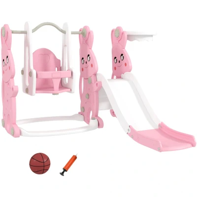 AIYAPLAY Toddler Slide and Swing Set 4 in 1 with Climber, Basketball Hoop, Kids for Age 1.5 4, Children Activity Centre Playground Indoor Outdoor Garden, Rabbit Themed, Pink