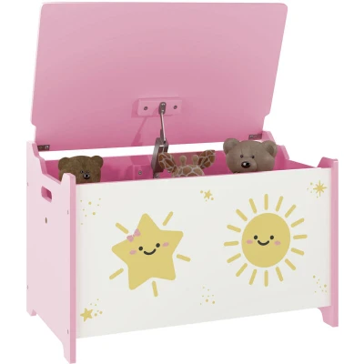 General description This AIYAPLAY large toy box offers spacious storage to easily organize kids' toys, books, and clothes, helping keep the room neat and clutter-free. It is a practical and stylish storage solution for the living room, playroom, nursery, bedroom, and more. Technical specifications Colour: Pink Material: MDF Overall dimensions: 60L x 37W x 39H cm Inside storage space: 57L x 31W x 30H cm Approved Age: 3+ years Recommended Age: 3-8 years Weight capacity: 20 kg Safety standard: EN71-1-2-3 Item label: 311-101V80PK Usage Helps develop independent tidying habits in children. Great for use in different spaces. Other information Safety hinges prevent sudden lid closure, protecting little fingers during everyday use. Features a painted and printed finish that adds both durability and charm. Assembly required.