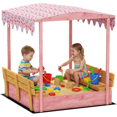 AIYAPLAY Wooden Sandbox with Lid, Canopy, Seat, Bottom Liner, Pink
