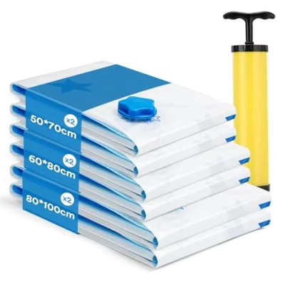 [Multi-Size Set Included]: Package contains 6pcs vacuum storage bags (2* 50×70 cm + 2*60×80 cm + 2*80×100 cm + 1* hand pump). Perfect for clothes, duvets, blankets, pillows, and bedding storage in home or travel [Space Saving Compression]: Strong seal and valve let thes space saver vacuum bags shrink bulky items, maximizing closet space and making storage or moving more convenient [Clean & Dry Protection]: Vacuum storage bags for clothes keep clothes and bedding safe from dust, damp, odors, and insects. Ideal for long-term seasonal storage while keeping items fresh and clean [Durable PA+PE Material]: Vacuum storage bags for duvets made of strong PA+PE, tear-resistant and long-lasting. Transparent design makes items visible. Easy to compress with hand pump or electric pump; for extra-large bags we recommend using a vacuum cleaner [Portable & Reusable]: Compact after sealing, easy to carry for moving, travel, or home use. Eco-friendly suction bags for storage are reusable, no-odor, and designed for repeated use