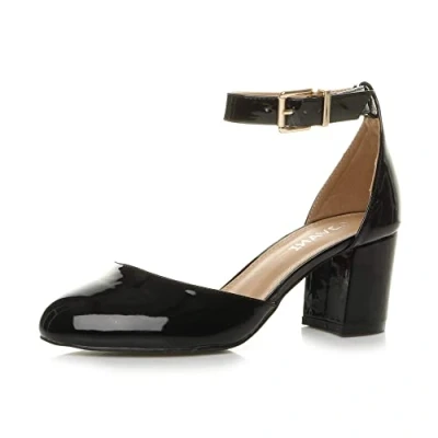 AJVANI Low mid Block Heel Ankle Strap Court Shoes Sandals Size 5 38 Black Patent