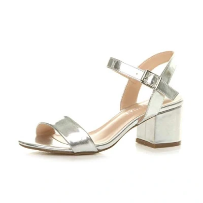 AJVANI Womenlow Block Heel peep Toe Ankle Strap Strappy Party Sandals Size 3 36 Silver Metallic