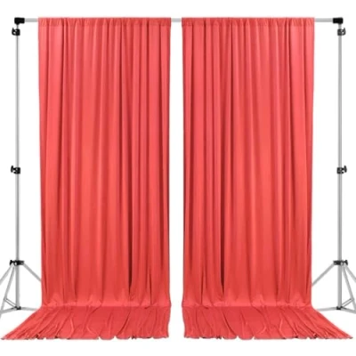 DIMENSIONS: Each order is for 2 (two) polyester curtains. Each curtain measures 5 feet wide x 8 feet high. Entire backdrop measures 10 feet wide x 8 feet high. MATERIAL: 100% High Quality Polyester - Polyester fabric is stain and wrinkle resistance; Can withstand various cleaning chemicals while maintaining it's elegant look through over 75+ wash cycles. USES: Perfect for weddings, receptions, parties, catered presentations, bridal and baby showers, birthdays, candy buffets, dessert tables and more. Used as drape for pipe and drape system also. QUALITY: Sides and bottom are serged for a clean finished look. 4-Inch Rod Pocket on the top. Cover stitch line sewn. Single layer, unlined, semi opaque decorative backdrop NFPA701 CERTIFIED: Our polyester drapes are Inherently Fire Retardant (IFR) and certified under NFPA 701, meeting the highest standards for indoor flame retardancy. Offering peace of mind during events, where safety is paramount.