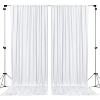 DIMENSIONS: Each order is for 2 (two) polyester curtains. Each curtain measures 5 feet wide x 8 feet high. Entire backdrop measures 10 feet wide x 8 feet high. MATERIAL: 100% High Quality Polyester - Polyester fabric is stain and wrinkle resistance; Can withstand various cleaning chemicals while maintaining it's elegant look through over 75+ wash cycles. USES: Perfect for weddings, receptions, parties, catered presentations, bridal and baby showers, birthdays, candy buffets, dessert tables and more. Used as drape for pipe and drape system also. QUALITY: Sides and bottom are serged for a clean finished look. 4-Inch Rod Pocket on the top. Cover stitch line sewn. Single layer, unlined, semi opaque decorative backdrop NFPA701 CERTIFIED: Our polyester drapes are Inherently Fire Retardant (IFR) and certified under NFPA 701, meeting the highest standards for indoor flame retardancy. Offering peace of mind during events, where safety is paramount.