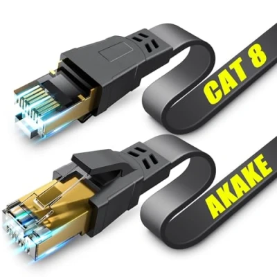 Akake Cat 8 Ethernet Cable, 6M Heavy Duty High Speed Flat Internet Network Professional LAN 26AWG, 2000Mhz 40Gbps with Gold Plated RJ45 Connector, Shielded in Wall, Indoor&Outdoor