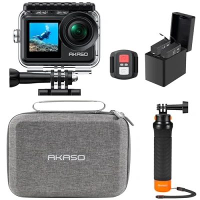AKASO Brave 7 LE Action Camera Floating Hand Grip Bundle Includes Waterproof Camera, Native 4K EIS 2.0 Dual Screen, Grip, 2 Batteries, Carrying Case, and Accessory Kits