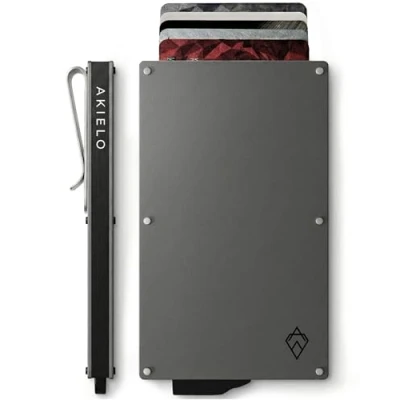 AKIELO RFID Blocking Card Holder with Money Clip and Gift Box Slim Minimalist Metal Blocker Wallet for Men Contactless Credit Protector (Alpha Titanium Edition)