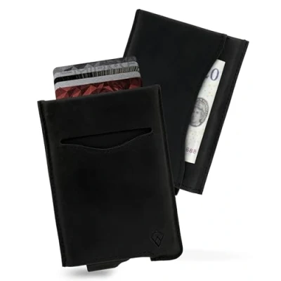 ✓ THE MODERN CLASSIC | Introducing ALPHA Leather, a beautifully crafted stylish leather jacket, meets our best selling minimalist card holder. Designed for comfort, strength and protection, with beautiful leather colourways, quick access ejector system and drop-safe card grips. With ALPHA Leather you can now carry additional notes and cards whilst still maintaining the slimmest of profiles in your pocket. ✓ STORE BOTH CARDS & CASH | Insert up to 5 embossed bank / credit cards into the card holder, which are typically thicker, or 8 flat cards and eject them all with ease using our stack & slide ejector wallet system. Prefer to keep more cash or cards on you, then add 2 more cards or some cash in the rear pocket and remove them with ease with our deep pocket design and smooth leather, which has been hand selected for the best combination of durability and touch. ✓ A PERFECT GIFT | The AKIELO Wallet will arrive beautifully presented in our luxury matte black gift box. A gift for every occasion and perfect for those gents looking for a beautifully crafted mens wallet. All three colourways are beautifully stamped with the AKIELO hallmark reflecting the utmost style and workmanship. ✓ PROTECT YOUR PRIVACY | Contactless cards are now the norm and thieves are taking advantage of this, using card-reading apps and simple devices to clone cards and take your funds. The ALPHA Wallet guarantees contactless card protection. With our secure credit card holders, it's impossible for anyone to access your data. ✓ REPLACE THE OLD WITH THE NEW | The ALPHA Wallet is perfect for those looking for a lightweight and slim metal wallet or RFID card protector. With a similar thickness to that of an iPhone, it is a great alternative to conventional, bulky, leather wallets for men and protects your most important cards from bending and breaking.