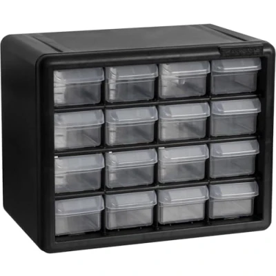 HEAVY DUTY CABINET WITH 16 DRAWERS: The 16-drawer small storage cabinet is made from rugged, high-impact polystyrene plastic and measures 26.67 cm W x 16.51 cm D x 21.59 cm H; The plastic drawers have dimensions of 15.24 cm x 5.72 cm x 4.13 cm for ample storage space GARAGE ORGANIZATION: The small cabinet is great for garages and workshops for both homeowners and businesses; The plastic storage drawers can be used as tool box, screw organizer or for battery storage; Keep nails and other small parts accessible CLASSROOM ESSENTIALS: Teachers can use the stackable storage drawers for classroom organization; Use it as a teacher toolbox, art supply storage organizer, craft storage cabinet for scrapbook supplies, and more HOME STORAGE AND ORGANIZATION: This plastic storage cabinet offers many uses around the home; It can be a lego storage organizer, craft organizer, or sticker organizer; Use it for makeup storage and organization or for medicine and first aid supplies CABINET AND DRAWER FEATURES: Stack cabinets securely or wall-mount them using keyhole slots; Finger-grip drawer pulls provide easy access; Rear stop tabs prevent contents from spilling; Drawer dividers are included and molded into the back of the cabinet, Weight: 2.7 Pounds, Manufacturer: AKRPJ