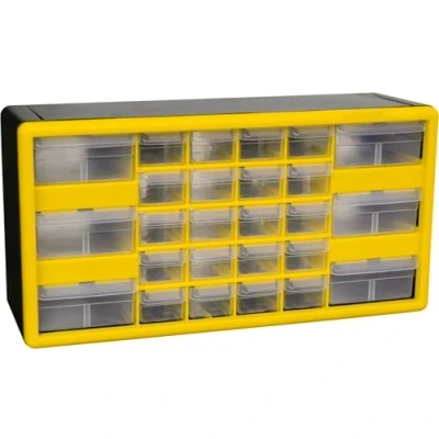 HEAVY DUTY CABINET WITH 26 DRAWERS: The 26-drawer small storage cabinet is made from rugged, high-impact polystyrene plastic and measures 50.8 cm W x 16.19 cm D x 26.03 cm H; Drawer dimensions - 15.24 cm x 11.59 cm x 5.56 cm (large); 15.24 cm x 5.64 cm x 3.97 cm (small) GARAGE ORGANIZATION: The small cabinet is great for garages and workshops for both homeowners and businesses; The plastic storage drawers can be used as tool box, screw organizer or for battery storage; Keep nails and other small parts accessible CLASSROOM ESSENTIALS: Teachers can use the stackable storage drawers for classroom organization; Use it as a teacher toolbox, art supply storage organizer, craft storage cabinet for scrapbook supplies, and more HOME STORAGE AND ORGANIZATION: This plastic storage cabinet offers many uses around the home; It can be a lego storage organizer, craft organizer, or sticker organizer; Use it for makeup storage and organization or for medicine and first aid supplies CABINET AND DRAWER FEATURES: Stack cabinets securely or wall-mount them using keyhole slots; Finger-grip drawer pulls provide easy access; Rear stop tabs prevent contents from spilling; Drawer dividers are included and molded into the back of the cabinet, Weight: 5.0 Pounds, Manufacturer: Akro-Mils