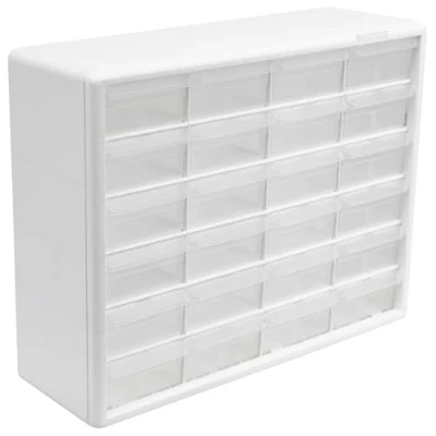 HEAVY DUTY CABINET WITH 24 DRAWERS: The 24-drawer small storage cabinet is made in the U.S.A. from rugged, high-impact plastic and measures 20" W x 6" D x 16" H; Organizer drawer external dimensions - 6" x 4-1/2" x 2-3/16" GARAGE ORGANIZATION: The small parts organizer is great for garages and workshops for both homeowners and businesses; The plastic storage drawers can be used as tool box, screw organizer or for battery storage; Keep nails and other small parts accessible CLASSROOM ESSENTIALS: Teachers can use the stackable storage drawers for classroom organization; Use it as a teacher toolbox, art supply storage organizer, craft storage cabinet for scrapbook supplies, and more; Drawers are safe for polymer clay HOME STORAGE AND ORGANIZATION: This plastic storage cabinet offers many uses around the home; It can be a lego storage organizer, craft organizer, or sticker organizer; Use it for makeup storage and organization or for medicine and first aid supplies DIVIDERS & MORE FEATURES: Drawer dividers are included and molded into the back of the cabinet; Stack cabinets securely or use keyhole slots to for wall mounting; Finger-grip drawer pulls provide easy access; Rear stop tabs prevent contents from spilling