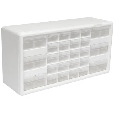 HEAVY DUTY CABINET WITH 26 DRAWERS: The small storage cabinet is made in the U.S.A. from rugged, high-impact plastic and measures 20" W x 6" D x 10" H; Organizer drawer external dimensions - 6" x 4-9/16" x 2-3/16" (large); 6" x 2-7/32" x 1-9/16" (small) GARAGE ORGANIZATION: The small parts organizer is great for garages and workshops for both homeowners and businesses; The plastic storage drawers can be used as tool box, screw organizer or for battery storage; Keep nails and other small parts accessible CLASSROOM ESSENTIALS: Teachers can use the stackable storage drawers for classroom organization; Use it as a teacher toolbox, art supply storage organizer, craft storage cabinet for scrapbook supplies, and more; Drawers are safe for polymer clay HOME STORAGE AND ORGANIZATION: This plastic storage cabinet offers many uses around the home; It can be a lego storage organizer, craft organizer, or sticker organizer; Use it for makeup storage and organization or for medicine and first aid supplies DIVIDERS & MORE FEATURES: Drawer dividers are included and molded into the back of the cabinet; Stack cabinets securely or use keyhole slots to for wall mounting; Finger-grip drawer pulls provide easy access; Rear stop tabs prevent contents from spilling