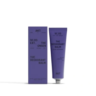 AKT, THE DEODORANT BALM. Award winning, multi use, natural deodorant. Plastic Free. Gender Aluminium 100% effective — 1 tube lasts up to 3 months. SC.03 ONSEN. 50ml