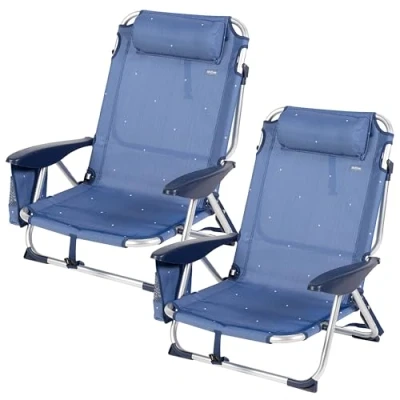 Set of 2 Low Beach Chair and Multi Position Sun Lounger Chair: 4 Position Reclining Backrest Including Sun Lounger Lightweight and sturdy aluminium frame: each chair supports up to 110 kg Breathable textilene seat and back: durable, easy to clean and quick drying material Padded cushion, side pocket with double compartment and anti-tip stops: extra comfort, storage and safety Foldable design with carry handles and click closure: easy to carry and store