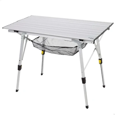 LIGHTWEIGHT, STRENGTH AND DURABILITY: Made with aluminum board and frame to withstand prolonged use and ease of handling; this folding camping table supports 30kg STABILITY AND SAFETY GUARANTEED - With non-slip stops designed to prevent slipping, this table offers unmatched stability on all types of surfaces; Whether on indoor floor, grass or sand, the table stays firm and stable, ensuring everything on top stays in place Adjustable in height: the legs of the folding table can be adjusted between 45 - 70 cm, allowing it to adapt to sloping terrains or uneven ground, as well as the height of the person who uses it Extra multi-purpose space: just under the table top, the camping table incorporates a removable mesh on which you can place different objects so you can always have them at hand Ease of transport and storage: disassemble the table top and fold the legs of the camping table into its carry bag (included) occupying just 12 x 94 cm; ideal for storing and transporting in tight spaces