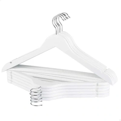 SUPERIOR STRENGTH & DURABILITY - Lightweight hangers made of high quality A wood, the highest within wood categories (A, B and C), with sturdy steel hook to prevent breakage and ensure long time use VERSATILE AND FUNCTIONAL DESIGN - Featuring a white design, this pack of 10 hangers is ideal for hanging all types of garments including shirts, jackets, dresses, suits and more NON-SLIP & PRACTICAL - The notches on the sides are perfect for garments with suspenders, preventing them from sliding, and the bottom bar is optimal for placing pants, keeping them in place and preventing creasing Swivel Hooks: 360° rotating, making it easy to hang and access clothes from any angle; This functionality is especially useful for organizing clothes on any type of closet rod, allowing greater flexibility and convenience when adjusting the direction of garments without having to move the entire hanger SPACE SAVING - The compact and flat design of these hangers allows you to optimize the space in your closet, allowing you to hang more clothes on a single rod; This helps keep your clothes organized and your closet more tidy; Each hanger measures 17.5x9 inches