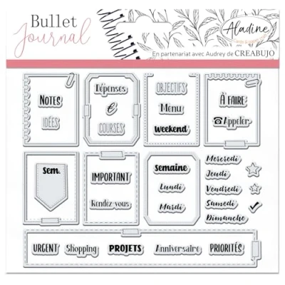 Fun and creative daily stamps: precisely stamp your notebooks and other diary to better organise yourself, with the themes of your choice (recipes, hobbies, holidays, etc.). A PARTNERING COLLECTION WITH AUDREY DE CREABUJO - This collection of Stampo Bullet Clear stamps was made in partnership with Audrey de CREABUJO. Audrey shares with Aladine a passion for bullet journaling, creation and organization. The collection is up to you to customise your bullet journal, structure your everyday life, follow your goals and make your dreams come true FULL RANGE - Hundreds of different stamps for every moment and situation. Discover Bullet Clear Banners & Icons, Cats, Kitchen, Holidays, Fruits, Unicorns, Seasons, or Month and Week Organization Stampo to arrange your schedules. The Stampo Trackers help you monitor your daily savings, water consumption, or even sleep, or see how your height and weight changes! ALADINE QUALITY: 15 to 35 clear stamps. The silicone footprint is cut around the design for drawing without unsightly border marks. For use with clear acrylic backing. Ideal for bullet journal or creative carding. DIY FUN WITH ALADINE - Do It Yourself finally accessible to everyone! Personalize your accessories and objects with paint, stencils, stampo... Create cards, announcements, make your own notebooks and bring colour and personal touch to your everyday items. Passionate about arts and crafts, Aladine is here to bring creativity, spontaneity and simplicity to all your creative desires.