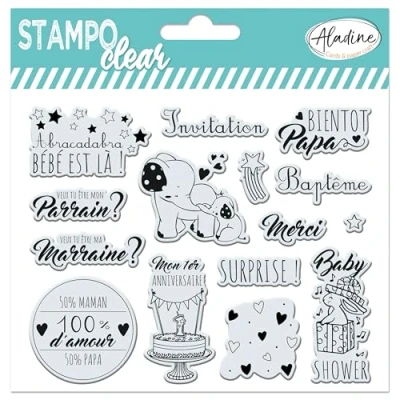 🏻 ANNOUNCEMENT BABY - Add a touch of sweetness to your creations with these 15 clear birth-themed stamps. Perfect for your scrapbooking, christening announcements, card making or decoration, they make every moment even more memorable. 15 baby pads – an assortment of tenderness: birth announcements, godparents, invitations, 1st birthday, thank you, hearts, elephants... all motifs to embellish your creations with emotion. Sheet size 12 x 14.5 cm, ideal for A5 holders Ultimate precision: thanks to their transparency, these pads allow for ultra-precise placement. Simply attach them to an acrylic block (ref. 04114 - sold separately) to visualize exactly where you are stamping. Ideal for layering or arranging designs with meticulous design. 👍 SIMPLE TO USE - Peel off the stamp from the board, attach it to the acrylic block, ink, then print on your creation. Simply wash it with water (with a little soap if needed), let dry, and replace for new use. French brand – Aladine is a French brand that makes "Do It Yourself" accessible to everyone. Felts, stamps, stencils, inks, paints, calligraphy... we are the specialists in decoration and creative awakening. All of our products are imagined in France, in our premises near Lyon (69).