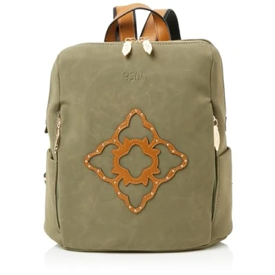 Faux leather backpack Ornament with studded decor Feather shaped zip pendant Two side zip pockets Spacious main compartment with side pocket