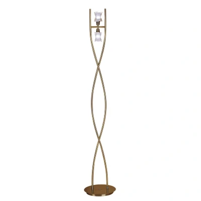The Alaska Floor Light showcases an elegant antique brass finish with two lights to brighten your living space. Its stylish design features frosted shades that provide a warm and inviting atmosphere.