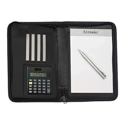 Alassio Corniglia in DIN A5 format, Made from high quality, black imitation leather and equipped with zip around fastening Inside: A5 pockets storage pouch, which offers plenty of space for documents, 4 business card slots, 2 flexible pen loops, Pocket Calculator with solar panel and writing pad a 5 The durable and well processed material of the folder for soft feel and the look is down to the classic and timeless design Ideal for use in work and program, as a gift idea for many special occasions such as birthday, Confirmation or Communion, youth dedication, study Beginn or racing into the work life Dimensions file (L/W/H): approx. 24 x 18 x 3, 5 cm, format: DIN A5, Weight: approx. 320 g, material: Faux Leather, Colour: Black, Item No: 30144