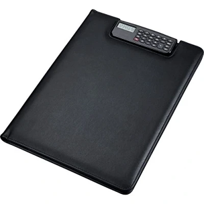 Alassio Brescia writing case in DIN A4 format, made of high-quality, black imitation leather and with practical clipboard function with integrated calculator as a clip Interior: A 4 slip pocket for documents, 2 smaller slip pockets, transparent compartment for business cards, pen loop, A4 writing pad and the calculator clip, always at hand thanks to the cut-out The durable and well-made material of the folder ensures a pleasant feel and the attractive look is created by the simple and timeless design Ideal for use on the go, for example on construction sites or in warehouses, ideal as a gift idea for special occasions, such as birthdays, starting study or starting work Dimensions of folder: approx. 33 x 25 x 2 cm, weight: approx. 520 g, material: imitation leather, colour: black, item number: 31500