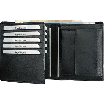 High-quality combination wallet from Alassio Portrait format with 10 credit card slots, 2 note slots, ID pocket and coin pocket. Made from the finest nappa leather Colour: black Outer dimensions: approx. 12 x 10 x 2 cm