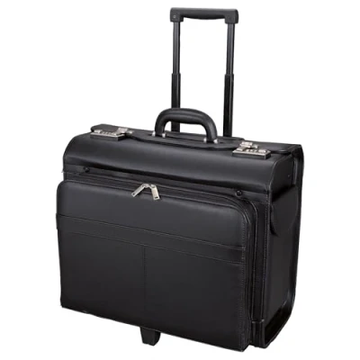 Premium pilot case with integrated trolley and two silver combination locks Made of imitation leather Large main compartment with document section Practical organiser within lid contains three pen loops and one business card compartment Two side pockets External Size: 455x265x400mm