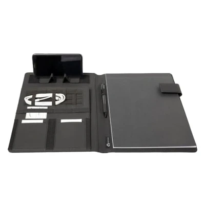 The DIN A4 writing case from the Stop Ocean Plastic line is made from recycled PET nylon fibres. Sustainable production promotes environmental protection by less plastic in the oceans The sophisticated conference folder has flexible multifunctional bands on the left side, 2 flexible slip pockets with business card compartment, a mobile phone / tablet stand and a pen loop On the right side there is a DIN A4 writing pad, which is attached in a slip compartment and can be easily changed, ideal for writing at any time Ideal for use at work and study, also as a gift idea for many special occasions, such as birthday, confirmation or communion, youth initiation, for the beginning of study or start to work Business folder with magnetic closure, outer dimensions: approx. 31 x 23 x 1.5 cm, format: DIN A4, weight: 540 g, material: imitation leather and recycled PET, colour: anthracite, item no. : 46221, EAN: 4021068462216