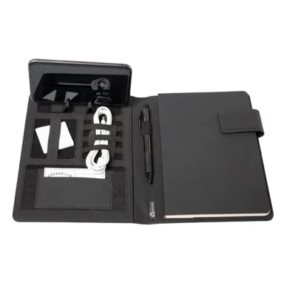 The DIN A5 writing case from the Stop Ocean Plastic line is made from recycled PET nylon fibres. Sustainable production promotes environmental protection by less plastic in the oceans The sophisticated conference folder has flexible multifunctional bands on the left side, a flexible slip pocket with business card compartment, a mobile phone / tablet stand and a pen loop On the right side there is a DIN A5 writing pad, which is attached in a slip compartment and can be easily changed, ideal for writing at any time Ideal for use at work and study, also as a gift idea for many special occasions, such as birthday, confirmation or communion, youth initiation, for the beginning of study or start to work Business folder with magnetic closure, outer dimensions: approx. 22 x 17 x 2 cm, format: DIN A5, weight: 180 g, material: imitation leather and recycled PET, colour: anthracite, item no. : 46222, EAN: 4021068462223