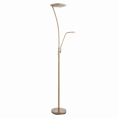 An LED mother and child floor light finished in an antique brass effect plate with a white frosted dish. Main light and task light can be lit together or separately from each other. Task light has an adjustable arm to direct light as required.