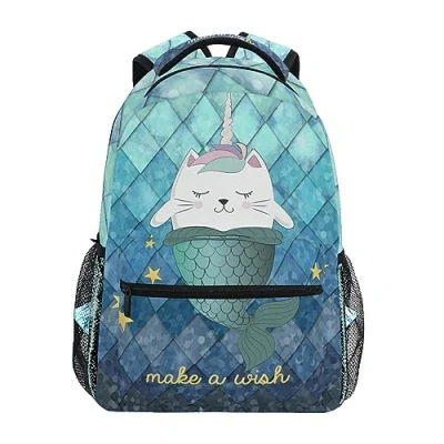 ALAZA Girls Unicorn Cat Backpacks for School Mermaid Scales Teal Blue Bookbags Kids Teen Toddler Fashion Daypack Rucksack Travel Laptop Bag