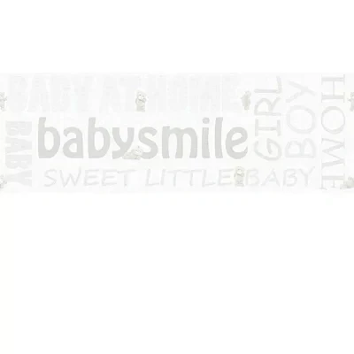 A sweet nursery border, with baby friendly text and tiny teddy bears. Some of the text is pale soft grey and cream and the background has a light weave texture. Shown in the White colourway. Paste the paper. Pattern repeats every 53 cm.