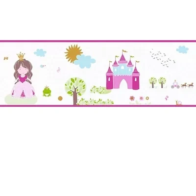 A pretty princess border, with princess, frog prince, castle, carriage and other little details making this perfect for your little princess! The white background has a light weave texture. Shown in the White colourway. Paste the paper. Pattern repeats every 53 cm.