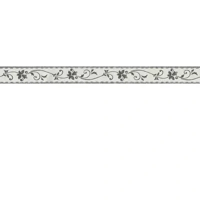 A traditional style border with a delicately stylised trailing leaf and flower pattern and stitch pattern edge. Show in the black on white. Self adhesive border - please request sample for true colour and texture. Pattern repeats every 32 cm.