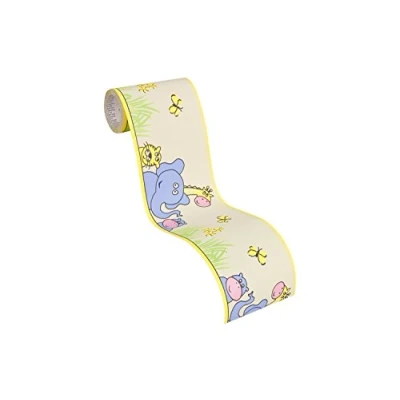 A cute animal scene in lemon yellow and grey. Butterflies, giraffe, elephant, tiger and hippo characters on a blown vinyl Self adhesive border - please request sample for true colour and texture. Pattern repeats every 65.5 cm.