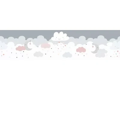 A delightful nursey style border featuring moons, clouds and stars. Shown here in the light grey colourway. Self adhesive border - please request sample for true colour and texture. Pattern repeat is 62.5cm.