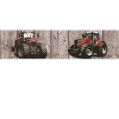 A child's border, with brown wood effect background and bold red coloured tractors with a light texture. Shown in the Brown colourway. Paste the paper. Pattern repeats every 53 cm.