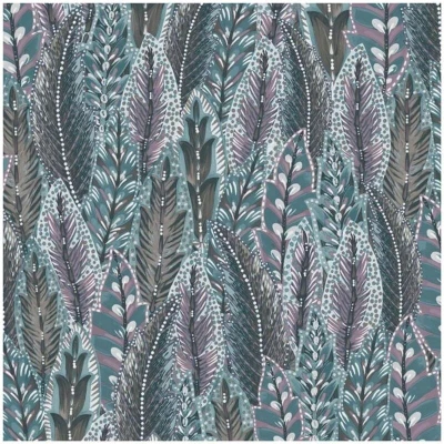 General description This captivating wallpaper features an artistic and whimsical design, bringing a lively and unique botanical aesthetic to your home. The pattern consists of a dense and repeating motif of layered feathers or stylized leaves, intricately detailed with fine lines and a hand-painted look. The overlapping nature of the design creates a feeling of depth and movement, making it a dynamic focal point in any room. The color palette is modern and enchanting, with feathers rendered in a sophisticated mix of deep blue, subtle purple tones, and earthy brown, complemented by small, delicate white dots scattered throughout. The design is set against a soothing sage green/dusty blue background, allowing the rich colors to stand out beautifully. This wallpaper is an excellent choice for a feature wall in a living room, bedroom, or dining area, creating a stylish and memorable statement. Technical specifications Roll Size: 10.05m x 53cm Approx. Coverage: 5.25msq (56 sq.ft) Pattern