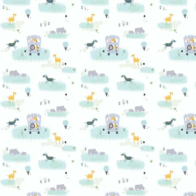 Cute animals take a trip on the big friendly bus in this gorgeous wallpaper design. Giraffes, hippopotamuses, zebras and camels are featured in this pattern which is ideal for a children's bedroom or nursery.
