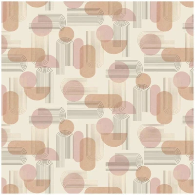 This vibrant contemporary wallcovering offers a cheerful and imaginative artistic statement, perfectly capturing the minimalist geometry and soft color blocking of the modern abstract style. The design features a playful, repeating motif of overlapping geometric shapes, all set against a clean, light background.The pattern is composed of various shapes—rounded rectangles, semicircles, and large circles—some rendered as solid blocks of color and others defined by fine, concentric line work. The sophisticated colour palette features warm, inviting tones of soft pink, muted terracotta, and orange. The shapes often overlap, creating subtle areas of translucent colour blending, lending the design depth and a gentle, fluid texture. The entire arrangement is set against a clean, luminous background, which allows the artistic shapes and fine lines to stand out beautifully. The overall aesthetic is effortlessly modern and undeniably fun, making it particularly well-suited for spaces that