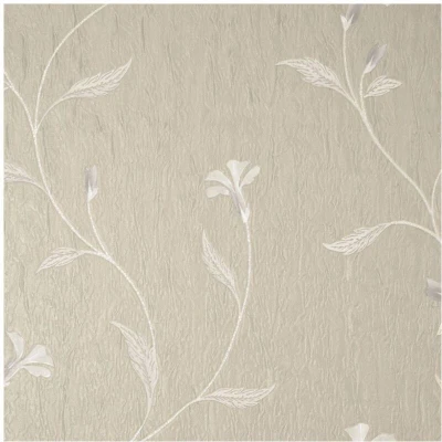 General description This elegant wallpaper presents a truly understated yet sophisticated floral design, perfect for cultivating a serene and inviting atmosphere within any interior space. The pattern features delicate, slender vines gracefully winding across the surface, adorned with subtle leaves and beautifully stylized blossoms that appear to gently unfurl. The background is a soft, warm light beige or creamy hue, enhanced by a finely textured finish that mimics the subtle creases of crumpled linen or gently aged plaster. This tactile element adds depth and visual interest, preventing the overall design from appearing flat. The floral elements are rendered in a lighter shade, likely an off-white or very light grey, creating a soft, harmonious contrast with the background. These blossoms and leaves feature a slight raised or embossed texture, further enhancing the delicate, three-dimensional illusion and adding to the refined feel of the wallpaper. The overall effect is one of