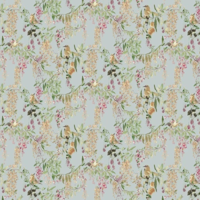 Beautifully cascading branches create a canopy of nature with perched birds throughout, looking for hanging blackberries and fruits.