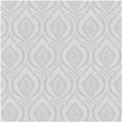 This truly timeless and sophisticated wallcovering introduces a classic damask motif, perfect for adding understated elegance and a touch of luxury to any room. The design features an intricate, repeating pattern of stylized floral medallions and swirling acanthus leaves, arranged within an elegant ogee-like framework. This traditional design is rendered in a refined, monochromatic palette of light grey tones, offering a subtle yet impactful visual statement. The light grey motif stands out gently against a very pale grey background, which has a delicate, almost fabric-like textured finish. Enhancing its refined appeal, subtle bits of glitter are scattered across the background, catching the light and adding a delicate shimmer that elevates the overall effect. This subtle contrast, texture, and sparkle create an illusion of depth and dimension, giving the entire surface a soft, inviting feel without being overwhelming. This wallpaper is an ideal choice for a serene bedroom, an elegant