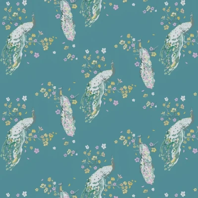 Introduce elegance, serenity and artistic beauty into your home with this stunning peacock wallpaper, designed to create a graceful and uplifting interior. Set against a rich teal background, the design features beautifully illustrated peacocks with flowing tail feathers, surrounded by delicate blossoms and gently drifting petals. The artwork has a refined, painterly quality, combining soft pastel tones of blush pink, cream, sage and muted gold that contrast beautifully with the deeper background colour. The peacocks are depicted with elegant posture and intricate feather detailing, bringing a sense of movement and sophistication to the design. Floral branches and scattered petals add lightness and balance, ensuring the pattern feels airy rather than heavy. The overall effect is calm yet decorative, making it ideal for interiors that aim to feel luxurious without being overwhelming. Perfect for feature walls or full room applications, this wallpaper works beautifully in bedrooms,