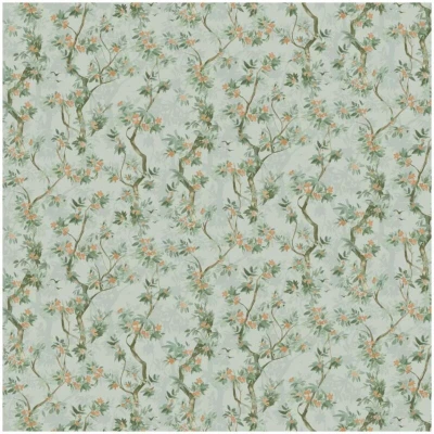 General description This enchanting vinyl wallpaper features a whimsical design with winding tree branches adorned with delicate blossoms and scattered birds, perfect for creating a serene and inviting atmosphere. The pattern showcases slender, organically shaped tree trunks and branches in muted brown tones, gracefully reaching upwards. Clusters of light green leaves and charming small orange flowers add a touch of soft color and natural vibrancy, while tiny silhouetted birds enhance the naturalistic scene. The soft, warm duck egg blue background has a gentle, aged texture, giving the wallpaper a timeless, slightly vintage appeal. This design is ideal for creating a calming touch in various spaces, including living rooms, bedrooms, nurseries, and dining areas. Technical specifications Roll Size: 10.05m x 53cm Approx. Coverage: 5.25msq (56 sq.ft) Pattern Repeat: 64/21.3cm Offset match Colour: Duckegg SKU: 36223 Installation Recommended application: Paste The Wall Scrubbable for